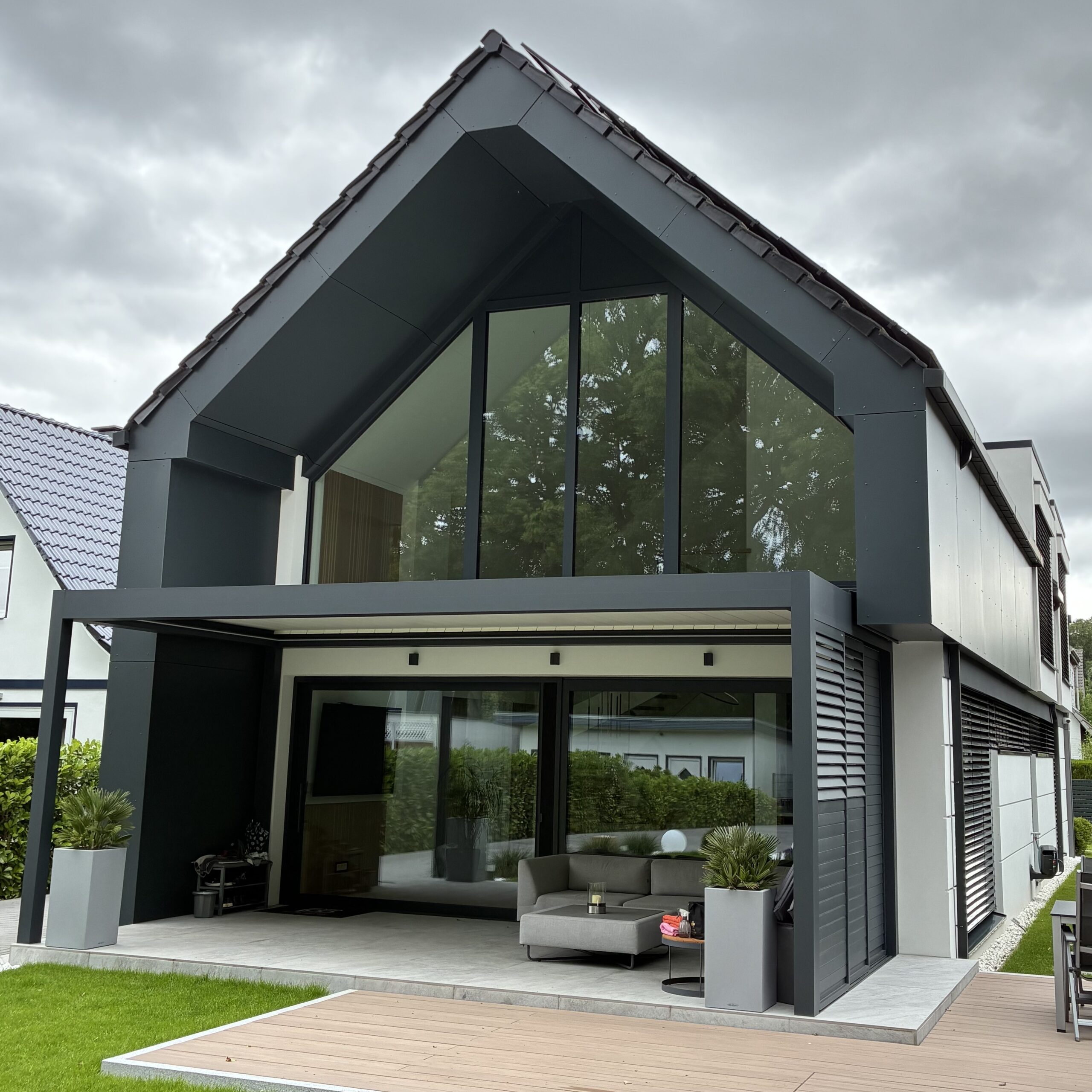 Modernes Neubauprojekt mit hochwertigen Kunststofffenstern in Anthrazit und Dreifachverglasung für optimale Wärmedämmung, Schallschutz und stilvolles Design.